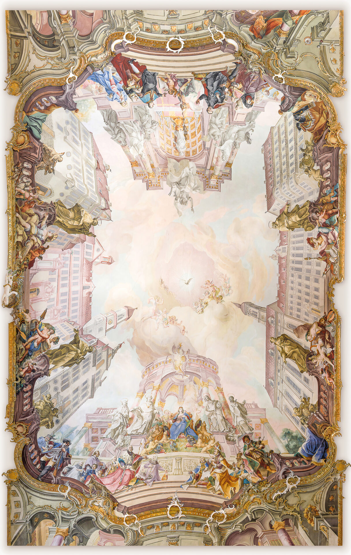 Hier sehen sie Das Deckenfresko im Goldenen Saal. Es wurde mit über 80 Einzelaufnahmen hochdetailiert fotografiert und zu einem Gesamtbild zusammengefügt.